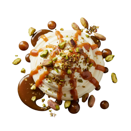 CREMIGE WHITE-CHOCOLATE-MOUSSE MIT GERÖSTETER PISTAZIE UND BUTTERWEICHER KARAMELL-CRÈME – FINE-DINING-DESSERT IN EINEM TROPFEN.